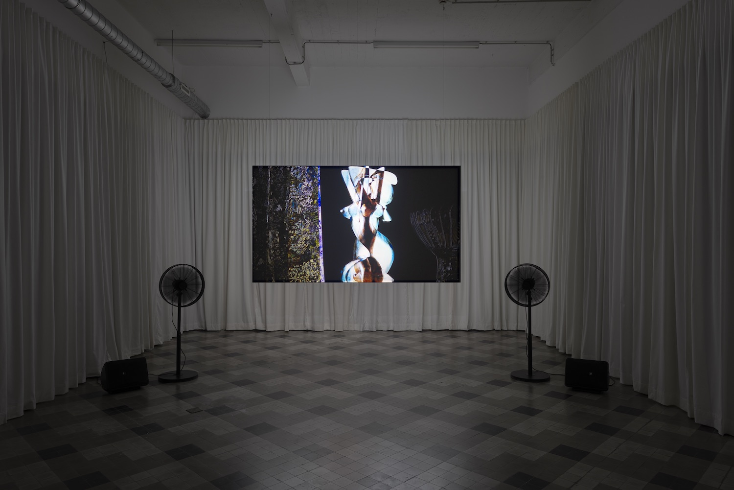 British artist Helen Dowling creates video installations and sculptures in which she explores the language of editing, of emotion, mimesis, anthropomorphism and the empathic potential of the moving image. She uses a multitude of images that she has found, downloaded or filmed herself to create video works that have a hallucinatory effect, taking the viewer on a visual trip that presents them with an alienating view of existence. At the same time, the works reference philosophy and poetry – from poet Kate Tempest to feminist thinker Hélène Cixous – and universal themes like the landscape and humankind’s impact on nature. From celestial bodies to wandering humans, images appear in apparently random succession, forming stories with no linear plot. Dowling combines her own footage with existing material, including digitalized images from magazines and stock videos. In the editing process, she creates an interplay of colour, movement, rhythm and sound, as an associative visual narrative with several layers of meaning emerges. In Dowling’s universe, the boundary between real and artificial is blurred. Some elements are recognizable: a sarcophagus, a young woman, the interior of a coffeeshop. Without entirely abandoning figuration, Dowling approaches abstraction in an almost painterly fashion. With their penetrating soundscapes her works are an immersive experience.