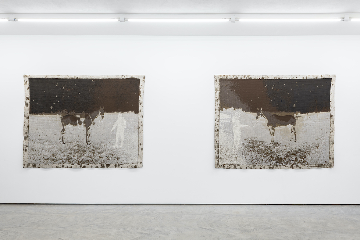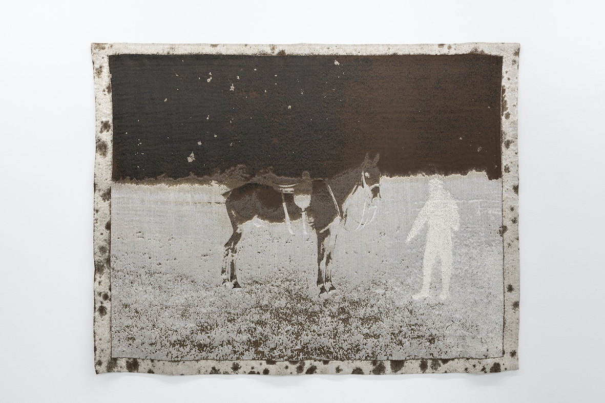 The work of the five artists in Chance is Logical is diverse, in terms of form as well as content, but shares a common concern for the way in which the present is tinged by the past, and the past conversely assumes new urgency in the present. The works shown by Laurence Aëgerter (1972, FR) come from a series of five jacquard tapestries titled The Somnambulic Archive. The tapestries are based on photographs from the archives of Museum Van Loon in Amsterdam. For her tapestries The Horse’s Guides, 2012, Aëgerter used phosphorescent threads in order to pivot the historical narrative of the original image: emerging from the darkness, next to the saddled horse, is the outline of a servant. This figure, which had been scraped away in the original photograph and retouched with brown ink, was given back his own place in the family’s history thanks to the artist’s intervention.