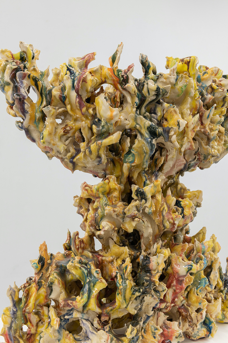 Some figures have been kneaded into shape, while others are transferred decals of flora and fauna, like those marketed by the company Mulder during the 1950s for the decoration of bowls and vases. The pictures of cows, sheep, chickens and even an occasional farmer’s wife playfully allude to Dutch farm life. At the same time they evoke associations with the world-famous porcelain produced by Meissen. When seen close up the multicolored figures look realistic, but at a distance they transform into patches of color which, in combination with the various hues of glaze, seem to give the sculpture an abstract character. In this way, via the color spectrum, Geelen allows time, and thus history, to become fluid.