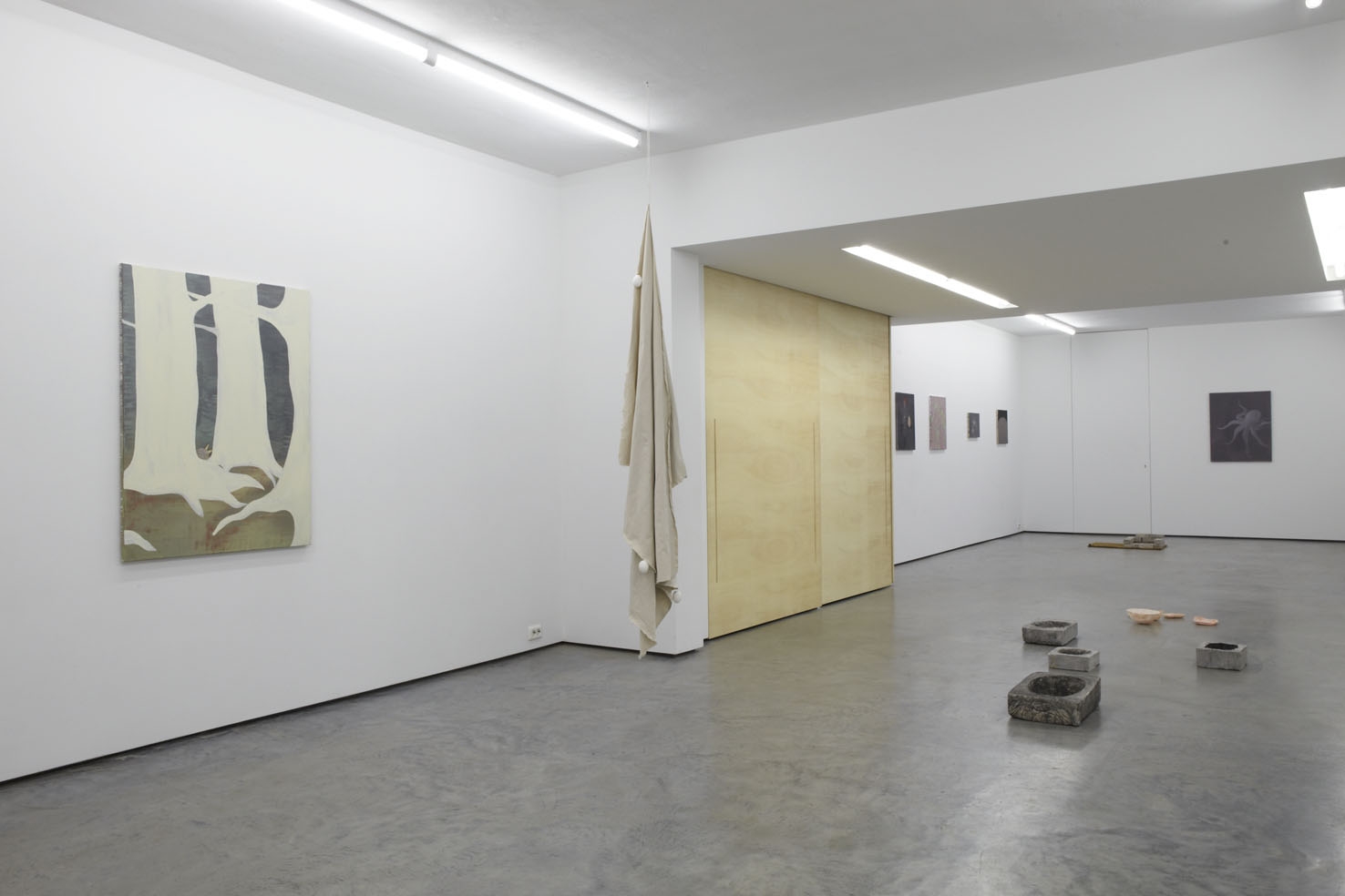 To Aldwin van de Ven (1980, Den Bosch) the paintings that he creates attest, above all, to a potential presence. Looming between the foreground and background, in the various layers of paint—even in scrapings and painted-out parts of the image—is the possible. The sprouting of something from a sense, an observation or musing, a consideration, a dream that vanishes once it appears and then surfaces in another form, as a witticism, an effect, a classical image: in the visual thought of Van de Ven, everything revolves around the principle of restlessness. The images have a simple, laid-back, almost reduced appearance but are deceptive, being hybrid, descriptive by definition and independent of time and identity. Here the world flows in frozen motion: vase, squid, duck, fishermen, boat, clown, corner, face, space. Transformation upon transformation.