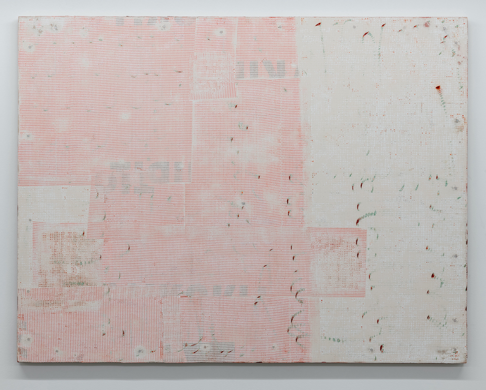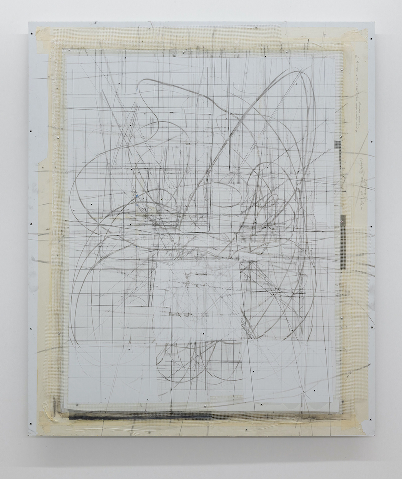 Van Eyk often presents his paintings as part of a spatial intervention. For his third solo exhibition at the gallery, he has decided to leave out the ‘building’ and show only paintings – a presentation without an overall concept. Those recent paintings reveal a different vantage point: this time Van Eyk seems to be observing the world from above. The painting ‘OPERA (PLANE) II’, 2024, evokes associations with complex intersections in highways, magnified and seen from above, a bit like zooming in on a route in Google Maps. The painting consists of various types of netting and lacquer on which a pattern of lines and broader bands can be seen. The pieces of netting have been stretched, in layers, over a frame with plexiglas. The transparency of the plexiglas allows all traces of ‘quality of the plexiglas – to play a role as elements in the work. The result is a scintillating, almost graphic image.
