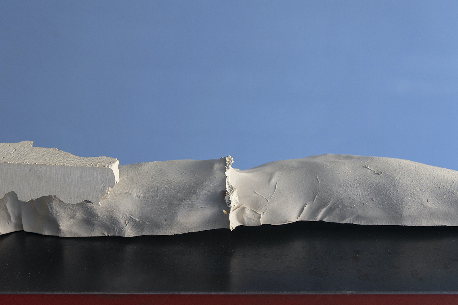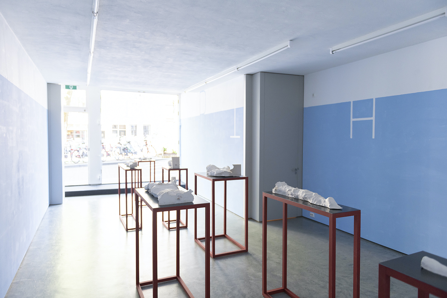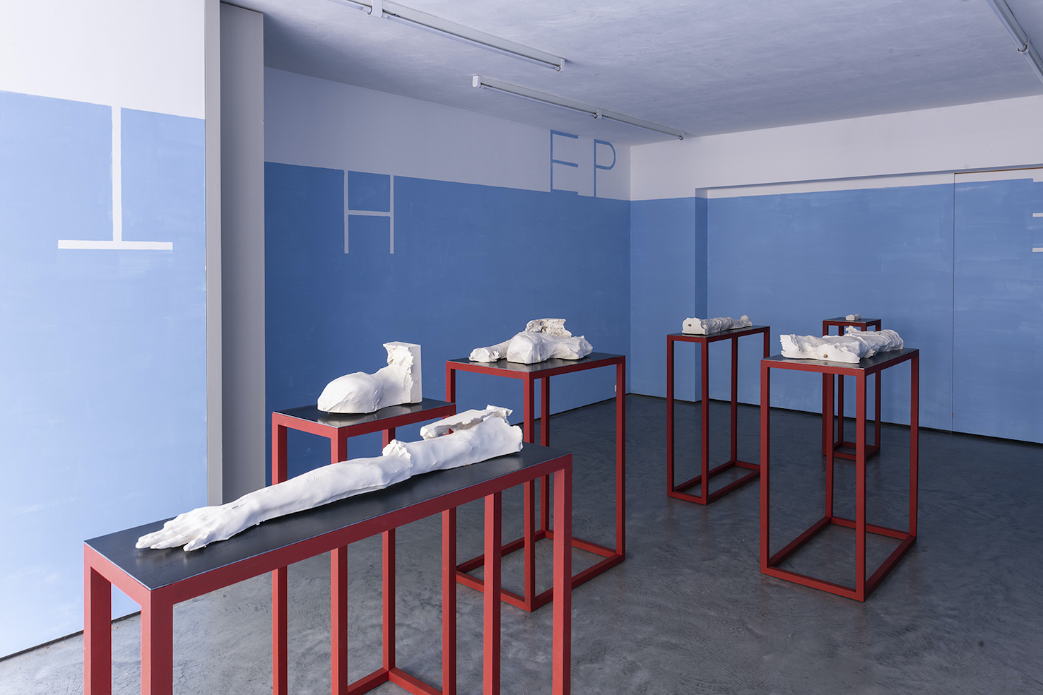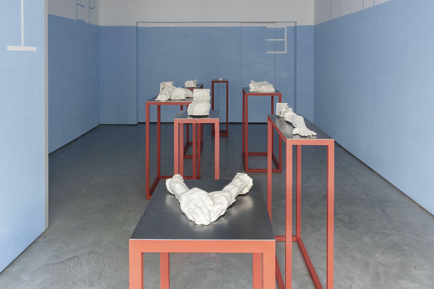 In the new, ambiguous space that has come about in this way, the visitor moves among sculptures consisting of red ‘tables’ which hold plaster castings, fragments of a body in a stretched-out position. The tables all have the same height, and together they form a horizon that divides the ‘upper’ world from the ‘underworld’. This idea of a horizon is repeated by the broad blue band that has been painted on the walls. The colors red and blue, the tables, the posture of a dive: all of these elements are based on The Tomb of the Diver (ca. 470 B.C.) in Paestum. That tomb contains a number of frescos revolving around a symposium scene – people reclining on tables, with wine and musical instruments – and appearing on the tomb’s cover is a depiction of a figure diving into water.