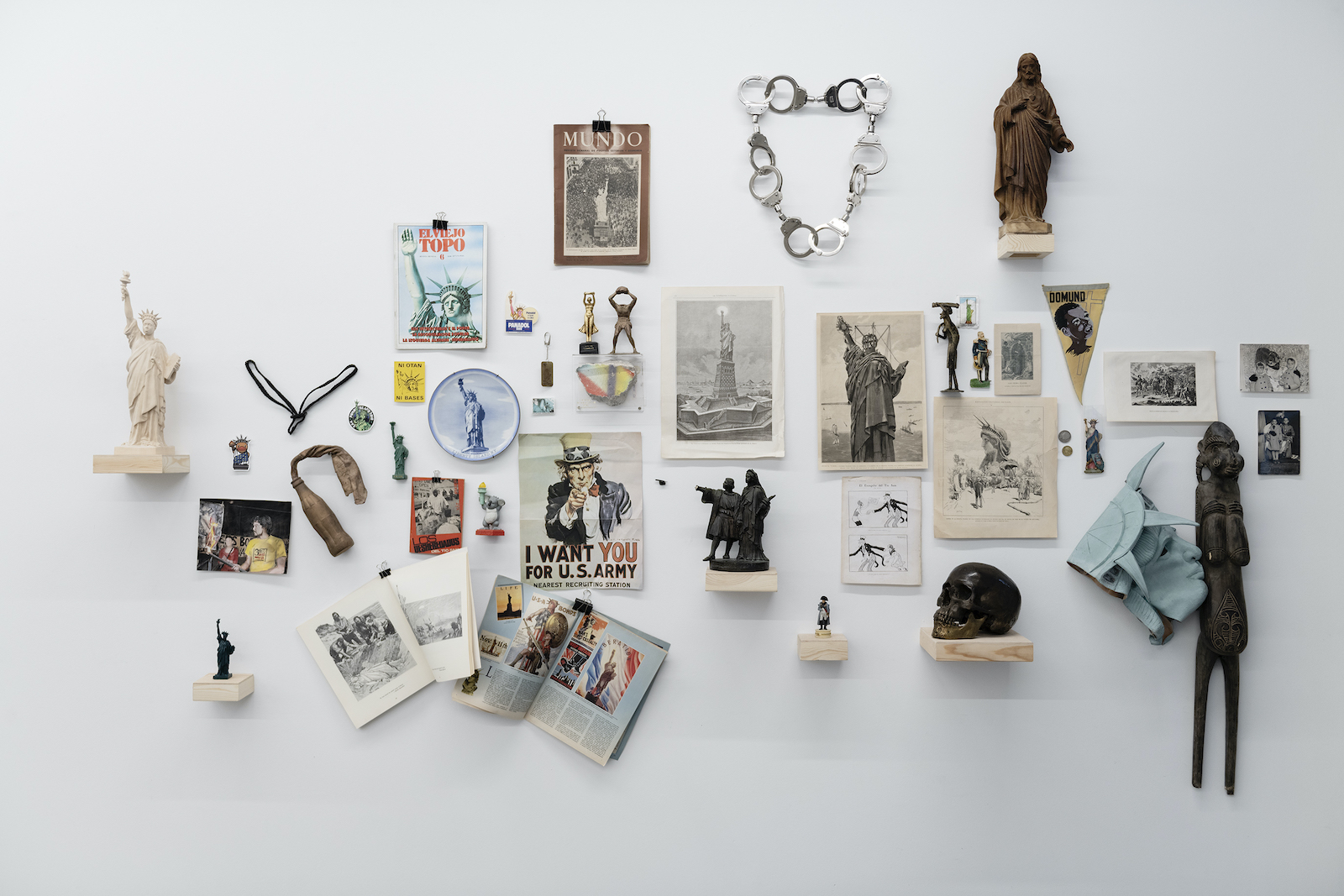 Another work in Sánchez Castillo’s exhibition Retro-Expectatives is a mental map, a collection of diverse objects brought together in an installation. Sánchez Castillo’s mental map is a representation of the history of the Statue of Liberty, based on a study of (hidden) information and the subjective interpretation of this.
