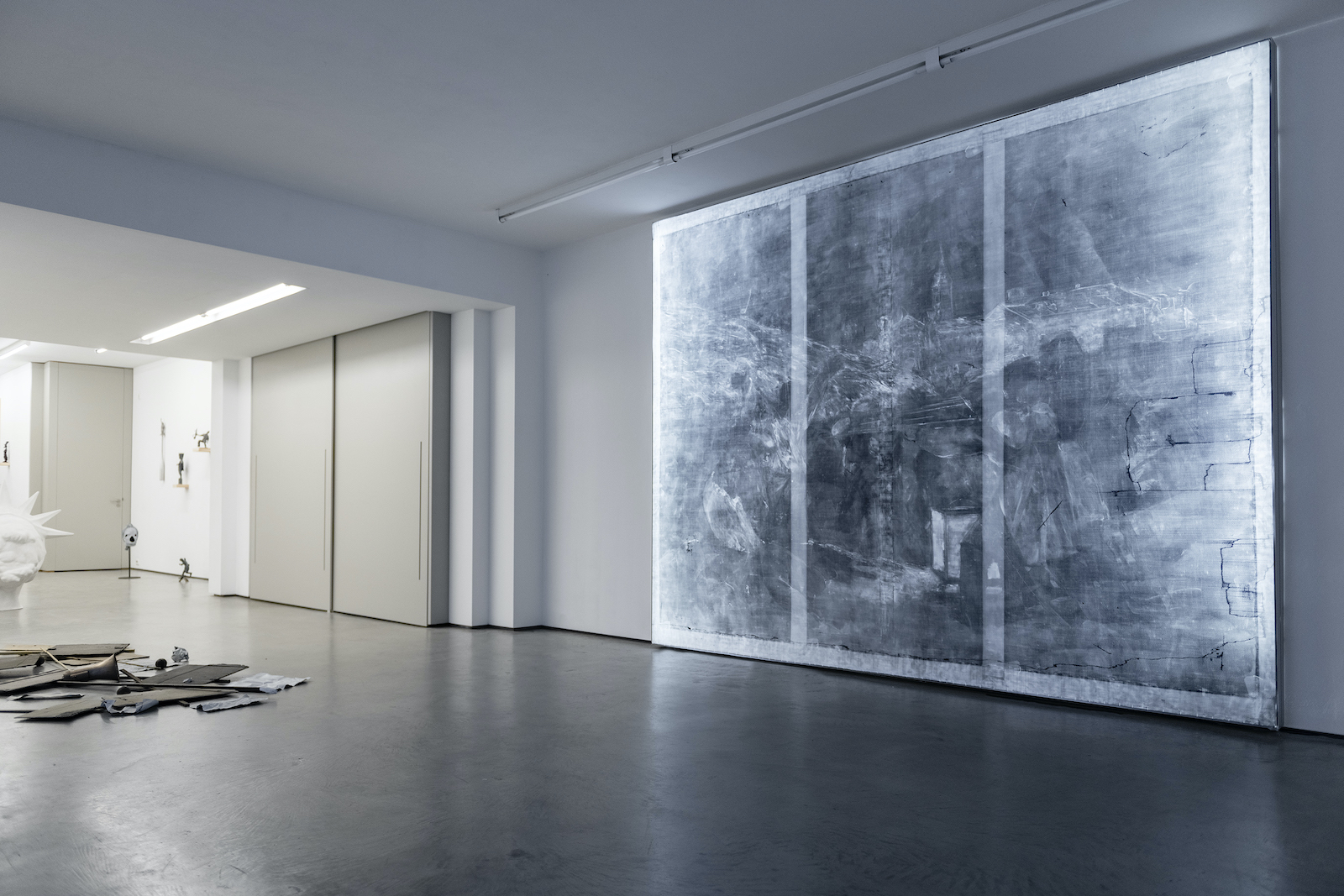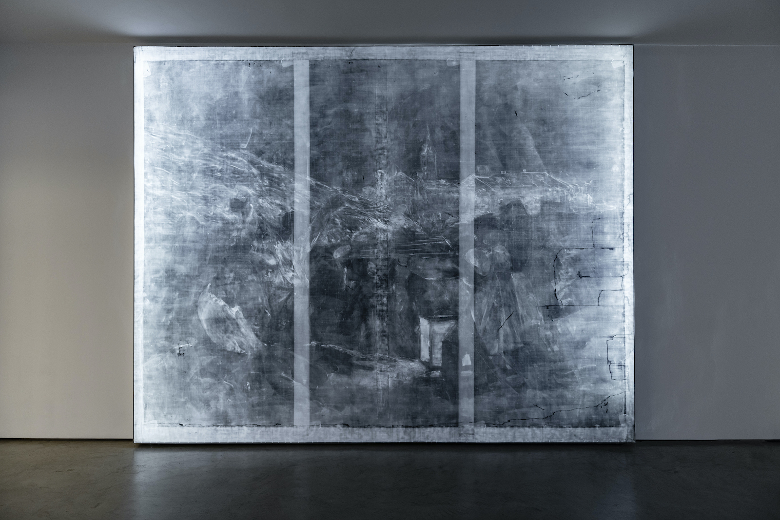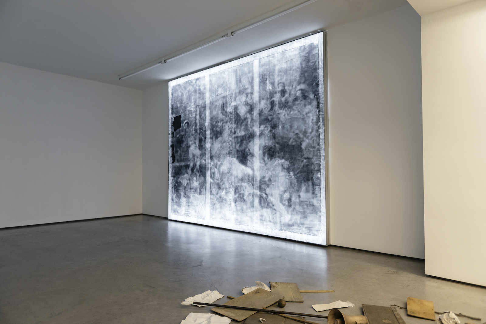 The work Hechos del 2 de mayo (Facts of 2 de Mayo), 2015, portrays the tension between freedom and justice in an incisive manner. Sánchez Castillo made a lightbox containing an x-ray exposure of Goya’s famous painting El 2 de mayo 1808 en Madrid, o ‘la lucha con los Mamelucos’ (The second of May 1808 in Madrid, or ‘The Fight against the Mamelukes’), which has the same measurements as the original. The image shows traces of damage done in 1939 as a result of bombardments during the Spanish Civil War. Conservation work carried out on the painting in 2008 restored it to its original condition, thereby causing the damage to vanish from view. Sánchez Castillo: “One of the most important anti-war paintings in history was damaged during our Civil War. (…) Now we can see that gap, that has been restored (…) as an abstract injection of reality into the painter’s composition.”