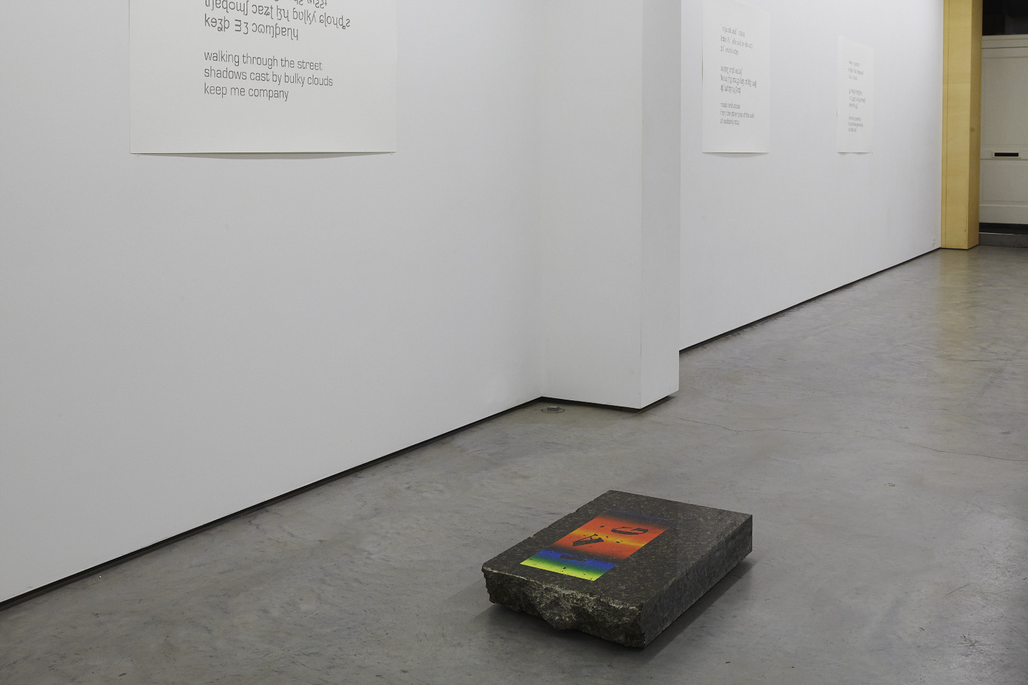 One of the works is titled Cloud. It consists of a large slab of extremely hard quartzite, onto which a rectangle containing the word ‘Cloud’ has been silkscreened. The letters of the word ‘Cloud’ have a strange, distorted look and seem to hover in a spatial void. The word resembles a verification code (CAPTCHA) that sometimes needs to be typed in when we request a new password on the computer. Should this ‘need to identify’ actually be met, Oosting’s airy cloud would prove to be a leaden one. The cloud-like appearance of the polished stone cannot counteract the gravity which is intrinsic to the object. The elegant, florid letters dissolve in the two-dimensional and seek a sense of volume by way of the word’s meaning. This is how Marc Oosting renders visibility to the clash between a material and more abstract, immaterial world, but also to that between intuitive and cognitive knowledge, between time and timelessness, between different (or shifting) dimensions. Though the material and the depiction may not be compatible, together they do form a portrayal of the effects of time. The drawings, each involving three versions of the same haiku written in pencil, also reflect on the notion of time; but here this relates to a linear process that ultimately leads to a dialogue of form, content and sound.