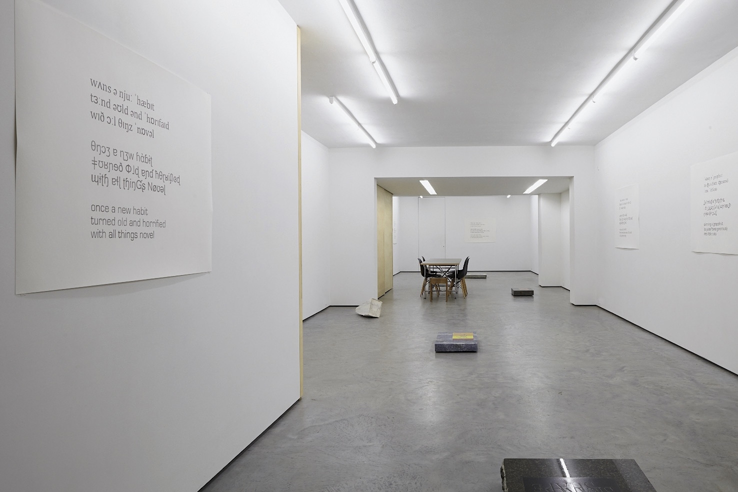 Azul bahia (blue Brazilian granite), grey granite, quartzite and marble: a number of individual slabs of stone placed throughout the space make up, along with a series of pencil drawings, the installation by Marc Oosting.