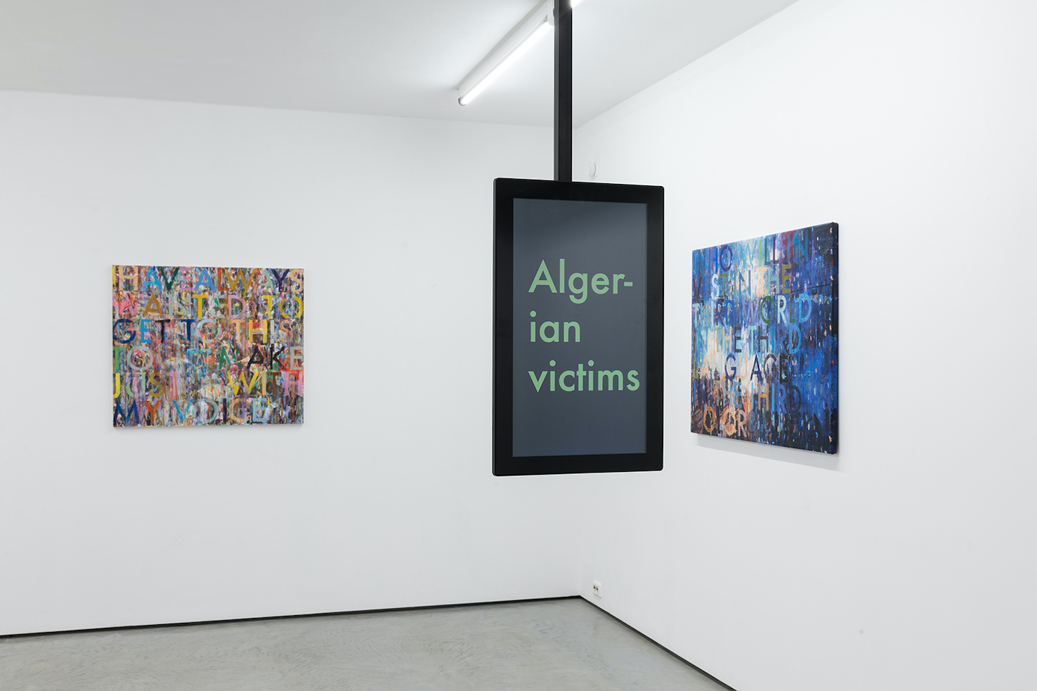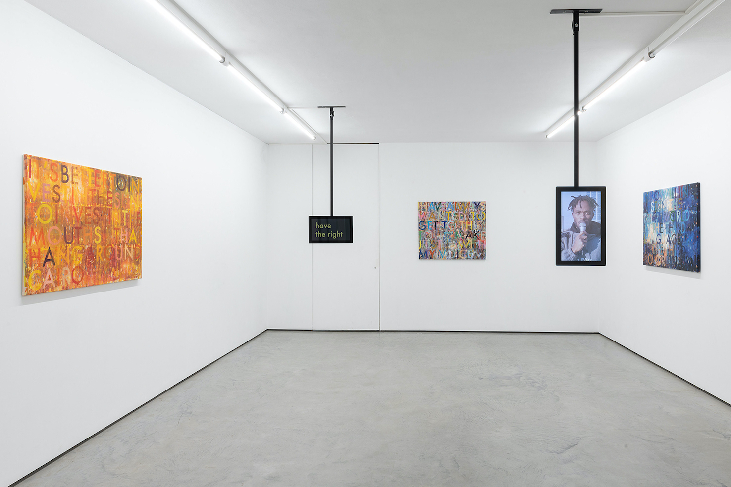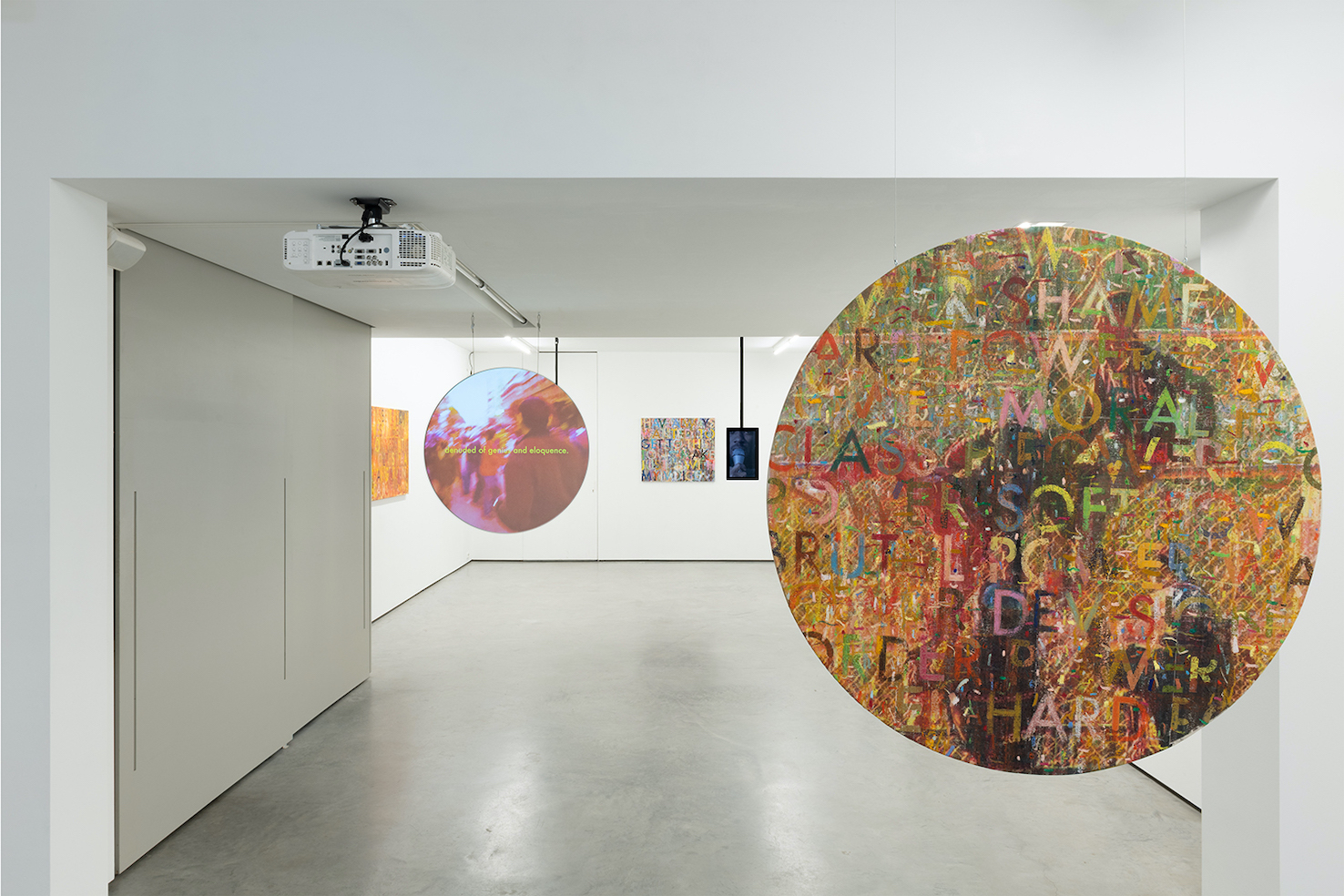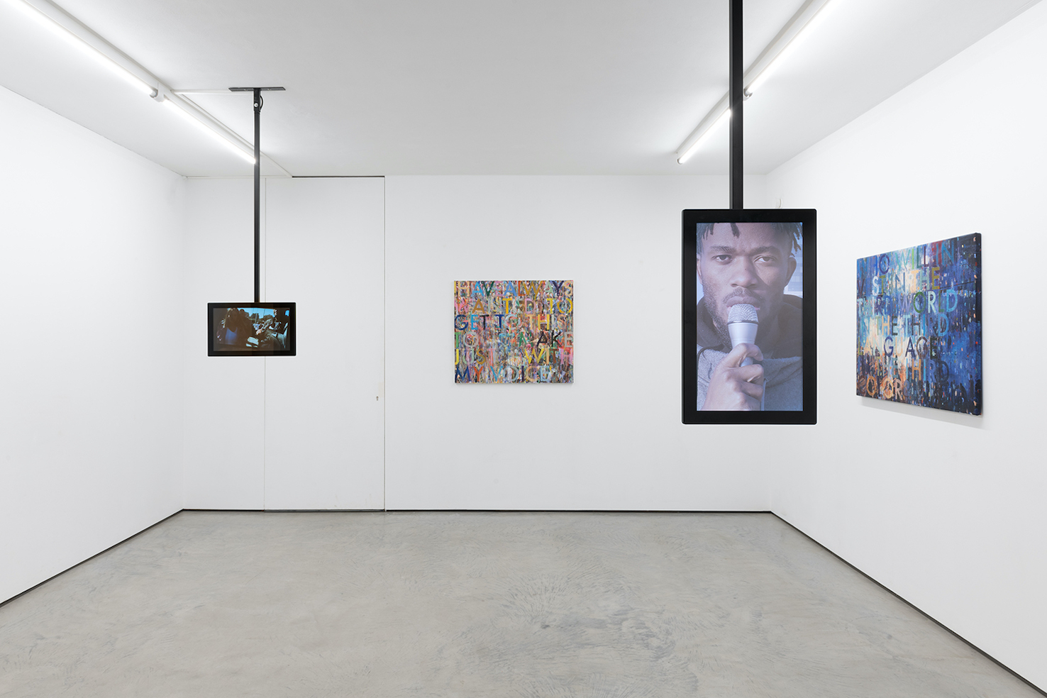 In his second solo exhibition at the gallery, You’re your country’s lost property with no office to claim you back, Hamza Halloubi presents an installation consisting of recent videos and paintings. In his work he makes unexpected connections between minor and major artistic and political events. This involves a portrayal of the complex relationship between art and power, between identity and representation. The work aims not to aestheticize or illustrate today’s cultural discourse, but to render images that reverse the position of the viewer.